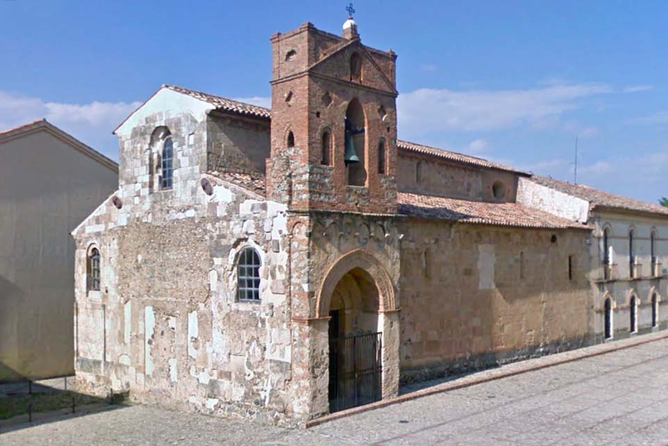 La Chiesa è un capolavoro d’arte dell’XI e XII secolo e potrebbe rappresentarsi come chiave per consentire l’accesso al tipico universo etno-antropologico arbëreshe di San Demetrio. La Chiesa di Sant’Adriano fu fondata da San Nilo di Rossano, monaco basiliano, eremita e forse il maggior personaggio del monachesimo calabro-greco, che nel 955 edificò in questo luogo una Chiesetta dedicata ai martiri Adriano e Natalia per istituire un cenobio non troppo distante dal villaggio. La Chiesa non ha mantenuto l’originaria unità strutturale e architettonica, tuttavia mostra linguaggi e messaggi stilistici differenti, che evidenziano una raffinata eleganza che spazia tra il mostruoso, il misterioso e il fantastico. L’accesso alla Chiesa è dato da due ingressi laterali, quello principale posto al di sotto del grosso campanile in pietre e mattoni, mentre l’altro è denominato Porta dei Monaci perché consentiva l’accesso alla Chiesa dei monaci dall’attiguo Collegio italo-albanese con stipiti in marmo e due mascheroni in pietra. All’interno le tre navate sono a copertura lignea e quattro arcate fiancheggiano la navata centrale sorrette da colonne antiche e da pilastri di fabbrica.